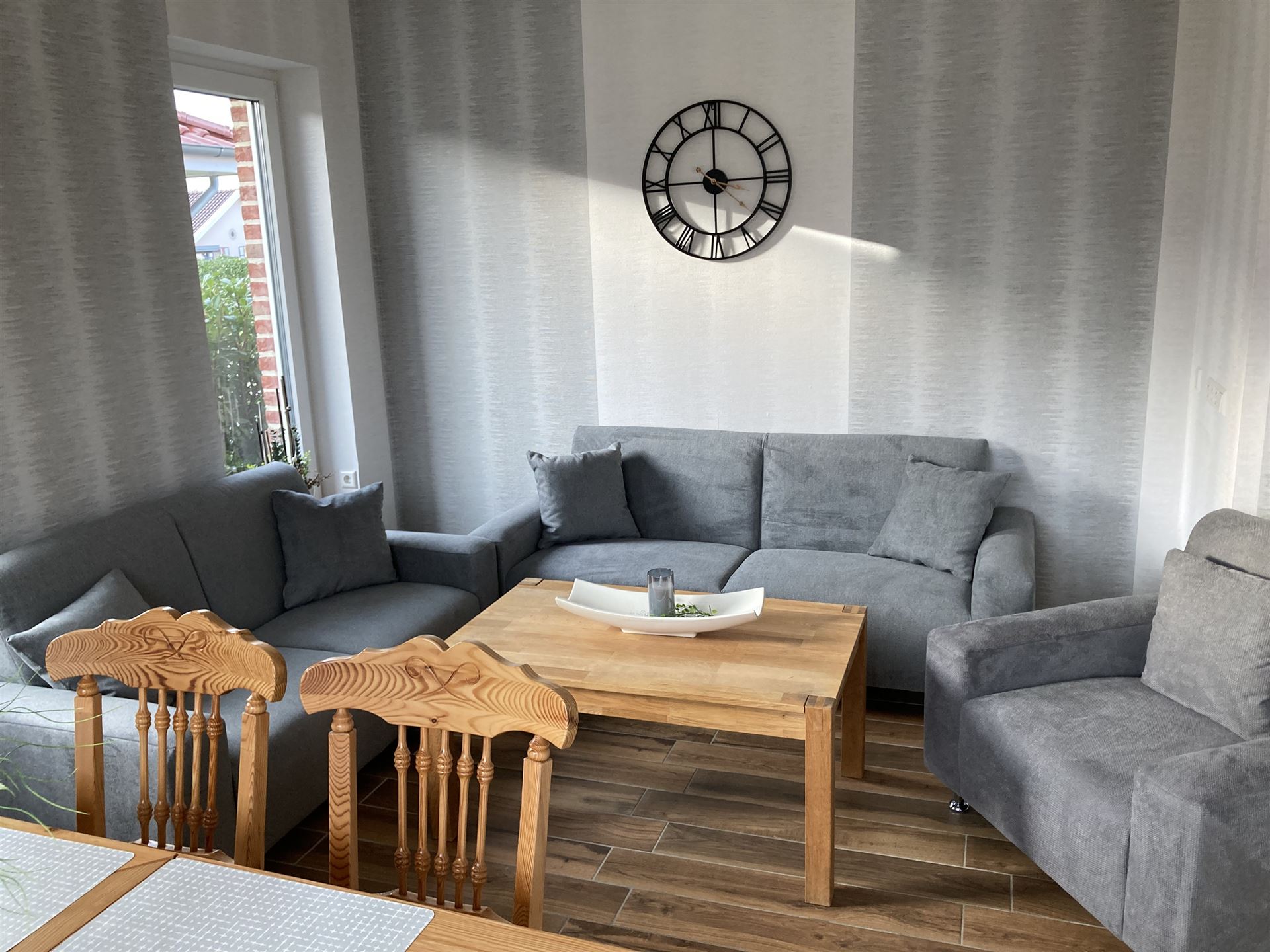 Das Ferienhaus Victoria verfügt über eine gehobene Ausstattung. Das Haus hat ein großes Wohnzimmer mit geräumigen Küchenteil im Erdgeschoss. Eine Essgruppe und ein großer Fernseher sowie eine Sitzgruppe befinden sich ebenfalls im Wohnzimmer. Insgesamt verfügt das Haus über drei Schlafzimmer mit insgesamt 6 Betten. Des Weiteren besteht die Möglichkeit ein Reisebett für ein Kleinkind dazu zustellen. Im Obergeschoß besitzt das Haus ein gesondertes Bad mit Dusche und Toilette. Ebenso befindet sich ein Bad mit Dusche und Toilette im Erdgeschoß. Eine Gästetoilette befindet sich ebenfalls im Erdgeschoß. Im Hauswirtschaftsraum hat das Haus neben einer Waschmaschine auch noch einen Trockner. Ein Kellerraum steht ebenfalls zu Verfügung.